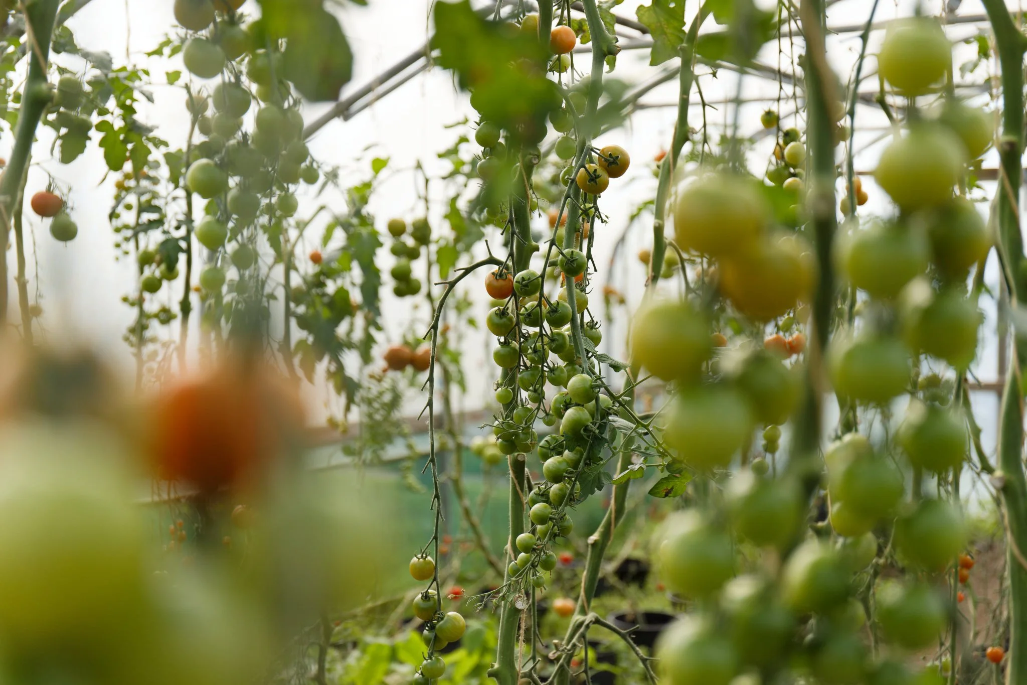 Tomatoes growing on vines in a poly tunnel at Brunswick Organic Nursery.