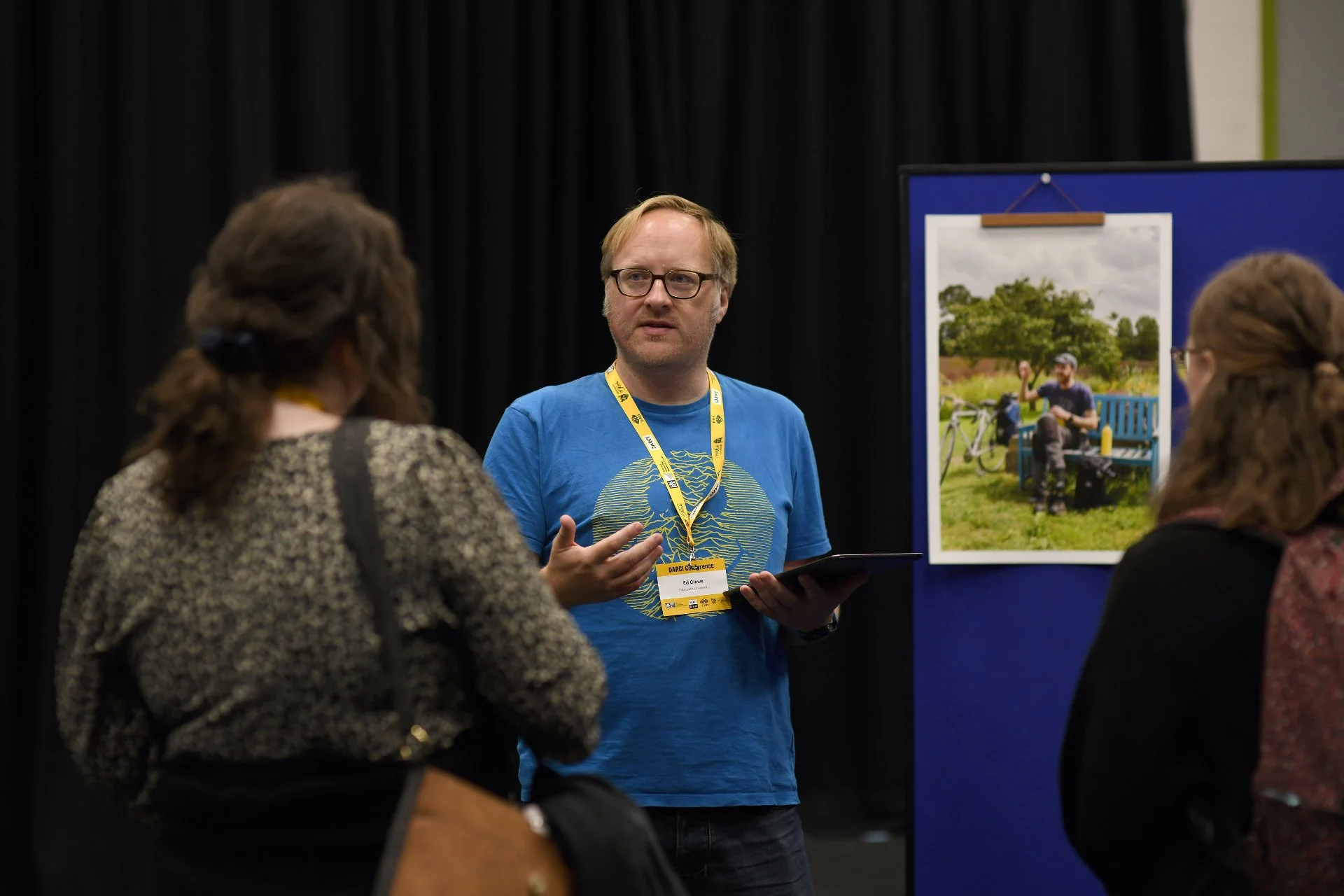 Me talking to attendees at a mini exhibition of my Right Here, Right Now… project work at the DARCI conference. Pic courtesy of Mariana Lopez at the University of York.